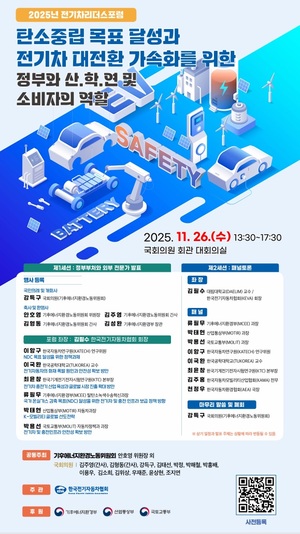 [중앙뉴스= 김진수 기자]한국전기자동차협회(회장 김필수)는 강득구 국회의원(기후에너지환경노동위원회),외 안호영 위원장, 김주영 간사, 김형동 간사, 김태선, 박정, 박해철, 박홍배, 이용우, 김소희, 김위상, 우재준, 윤상현, 조지연 공동주최로 “탄소중립 목표 달성과 전기차 대전환 가속화를 위한 정부와 산.학.연 및 소비자의 역할”의 주제로 11월 26일오후 2시에 국회의원회관 대회의실에서 한국전기자동차협회 주관으로 개최한다고 밝혔다이번 포럼은 기후위기 시대, 국가 온실가스 감축 목표(NDC) 달성과 지속 가능한 전기차 산업 발전을