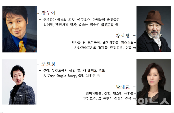 출연 배우로는 △장두이, △강희영, △주원성, △박새슬, △김희정, △박은재, △안호주, △김 산, △김수정, △황정후 등 70대 원로 배우부터 20대 신인 배우들이 함께 출연하여 호흡을 나누고 있다.