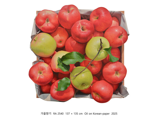 특히 이번에 첫 선을 보이는 황금빛 사과는 단순한 색채의 변주를 넘어 가을의 풍요, 그리고 귀한 결실을 상징하며 한층 격조 높은 회화적 세계를 드러낸다. 황금빛 사과는 작가 특유의 정밀한 묘사력과 감각적인 색채, 그리고 사과를 위에서 내려다보는 독창적인 시점인 부감시점(俯瞰視點)을 통해 작가 화풍의 정수를 보여준다. 전시는 11월 5일까지다.