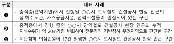 한편, 국토교통부는 지하시설물, 지반침하 이력, 지질정보 등 지하안전 데이터 기반 분석과 전문가 평가 등을 통해 직권조사를 위한 지반침하 우려구간을 선정하여 지반탐사를 추진 중이다. 국토교통부는 올해 8월 총 500km 조사구간을 확정하였으며, 연약지반 내 굴착공사가 진행된 현장 중 ➊지하시설물이 다수 밀집된 구간(200km), ➋최근 5년 이내 지반침하가 발생한 구간(200km), ➌지반침하 의심 민원이 다수 발생한 구간(100km)에 대해 연내 지반탐사를 완료할 예정이다.