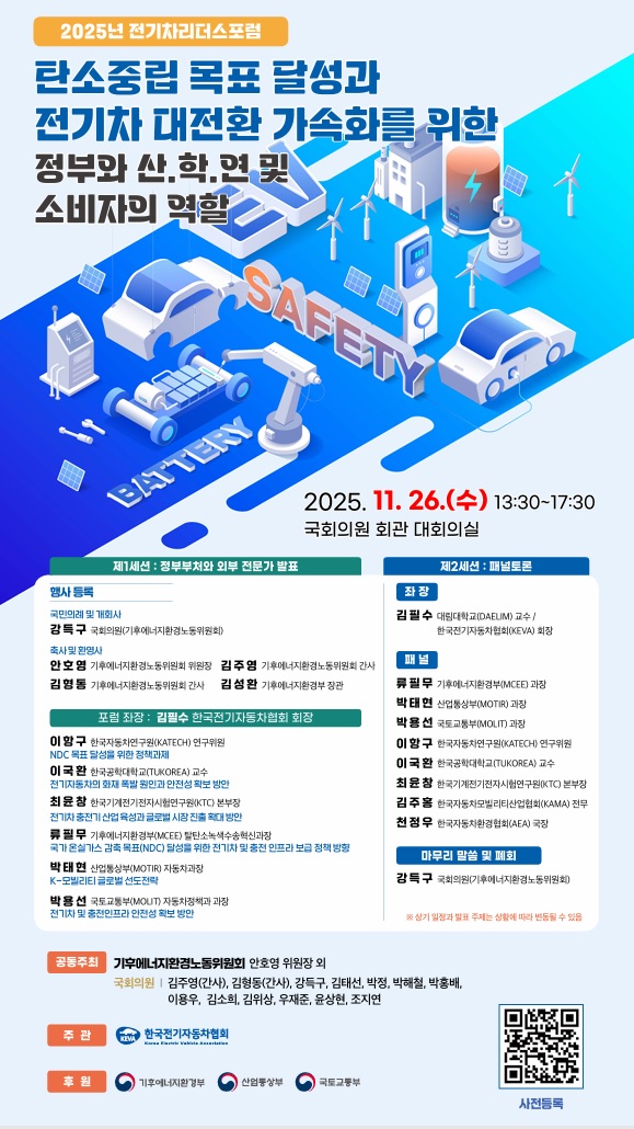 [중앙뉴스= 김진수 기자]한국전기자동차협회(회장 김필수)는 강득구 국회의원(기후에너지환경노동위원회),외 안호영 위원장, 김주영 간사, 김형동 간사, 김태선, 박정, 박해철, 박홍배, 이용우, 김소희, 김위상, 우재준, 윤상현, 조지연 공동주최로 “탄소중립 목표 달성과 전기차 대전환 가속화를 위한 정부와 산.학.연 및 소비자의 역할”의 주제로 11월 26일오후 2시에 국회의원회관 대회의실에서 한국전기자동차협회 주관으로 개최한다고 밝혔다